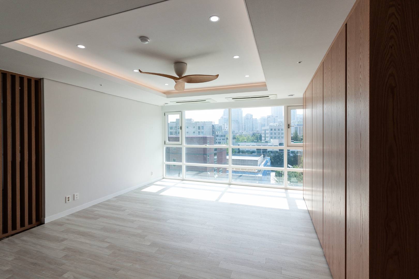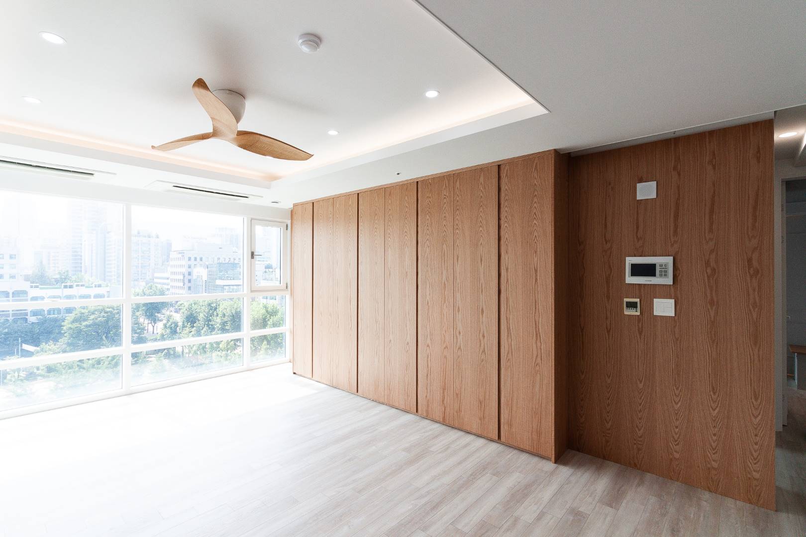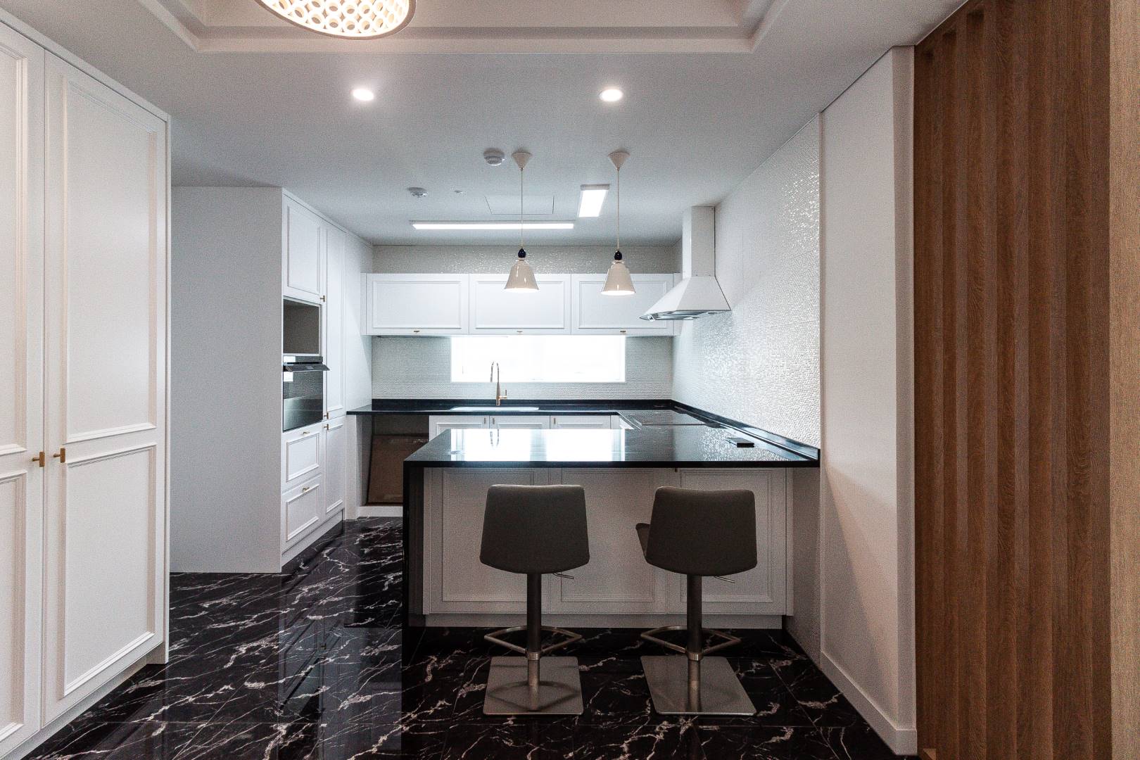 미디엄 우드톤 거실과 클래식한 키친 인테리어